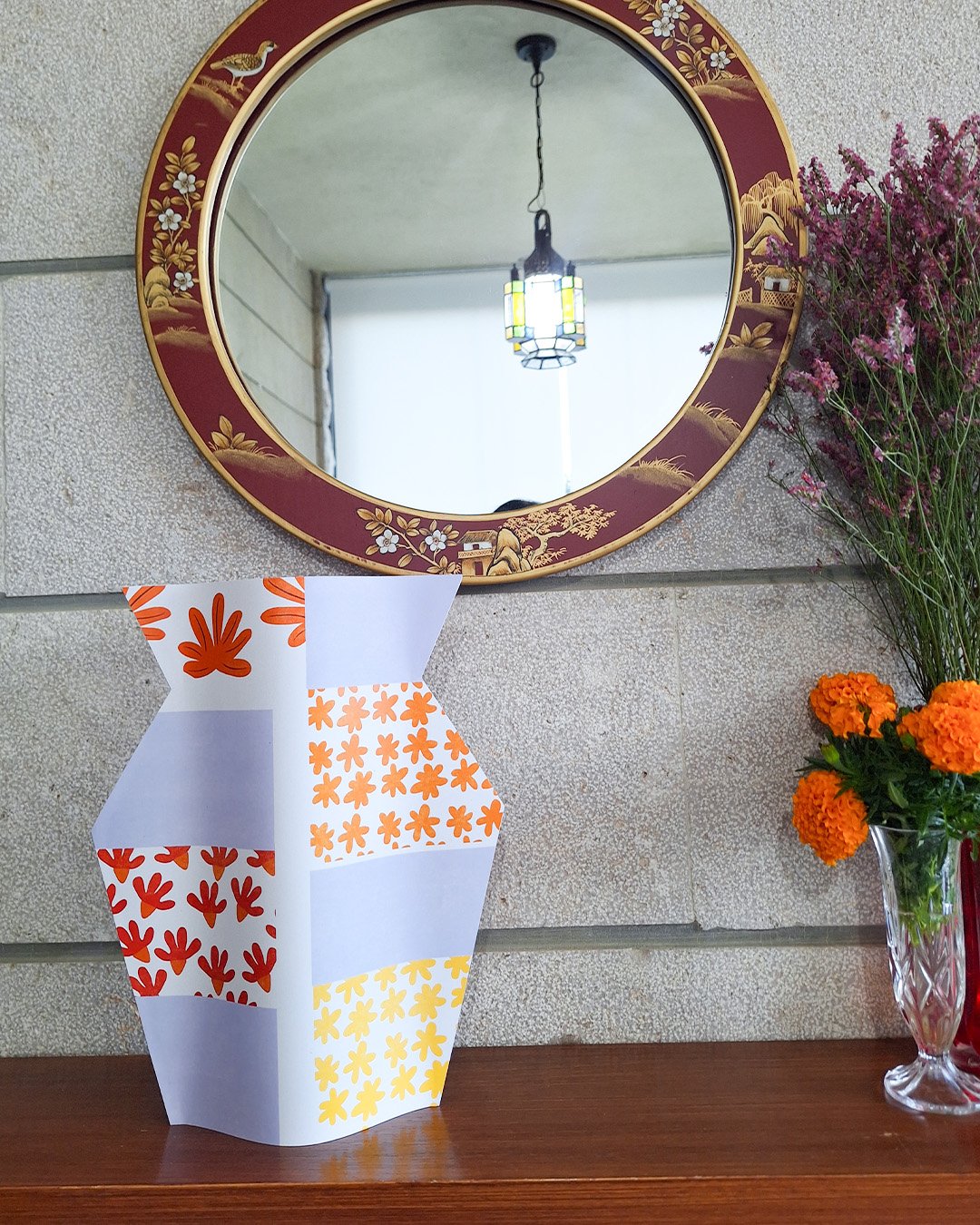 A charming and abstract paper vase cover capturing the layered colors and textures of a crisp fall day, truly embodying the spirit of the autumn season. This piece is printed on recycled paper and comes with an empty glass bottle.