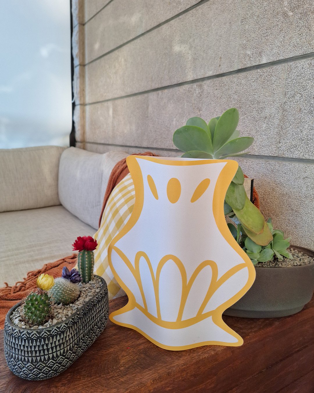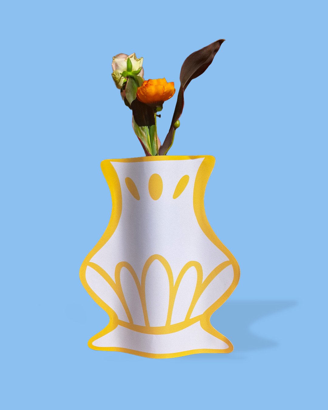 A timeless and elegant paper vase cover featuring a warm, golden-yellow pattern with flowing lines and a traditional shape. This decorative piece is printed on recycled paper and comes with an empty glass bottle for instant display, bringing a touch of enduring style to any room.